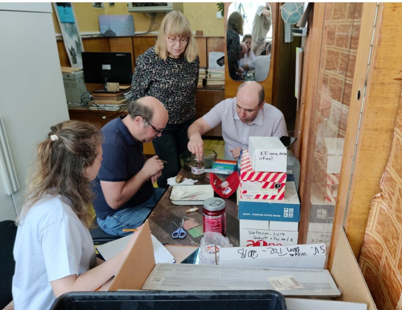 Четверо молодых учёных во главе с директором ФИЦКИА, чл.-корр. РАН Иваном Николаевичем Болотовым в период с 8 по 13 июня провели 3 рабочих и один экскурсионный день в тесном контакте с малакологами лаборатории пресноводных сообществ нашего Центра (заглавное фото). За это время: была просмотрена коллекция восточно-азиатских моллюсков и пиявок (рис. 2), определены наиболее перспективные направления совместных исследований, начата работа над серией статей по таксономии и филогении крупных двустворок-унионид и пресноводных пиявок (рис. 3). Также был проведён межинститутский семинар на тему «Разнообразие и диверсификация пресноводных моллюсков в крупных речных системах» и ряд консультаций с сотрудниками других лабораторий ФНЦ Биоразнообразия ДВО РАН(рис. 4).В праздничный день 12 июня был организован экскурсионный выезд на мыс Ликандера о-ва Попова, где расположен участок нацпарка «Земля леопарда» (рис. 5). По общему мнению, визит прошёл на редкость плодотворно, оставил у всех участников наилучшие впечатления, а также положил начало тесному сотрудничеству двух крупнейших российских центров изучения наземного биоразнообразия.