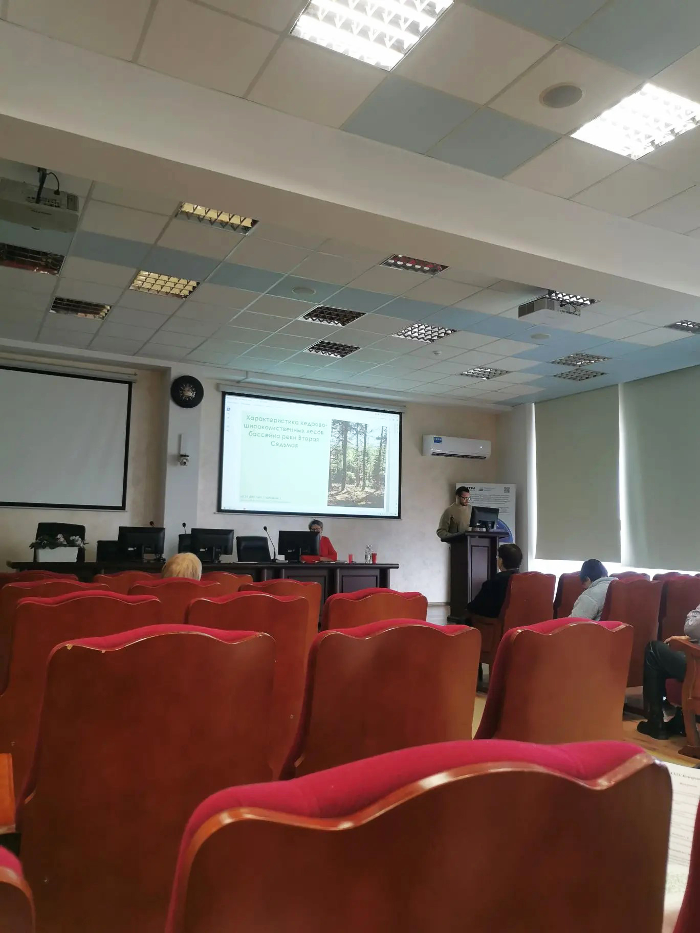 Далее было заслушаны доклады коллег из Института Водных и Экологических Проблем ДВО РАН о состоянии и перспективах изучения хвойно-широколиственных лесов Хабаровского края. Большой интерес вызвало выступление Великого Александра Станиславовича о кедрово-широколиственных лесах бассейна реки Вторая Седьмая с подробной характеристикой этих сообществ. О начальных результатах изучения темнохвойных лесов труднодоступной территории края – Тугурском полуострове, доложил Ткачук Георгий Сергеевич.