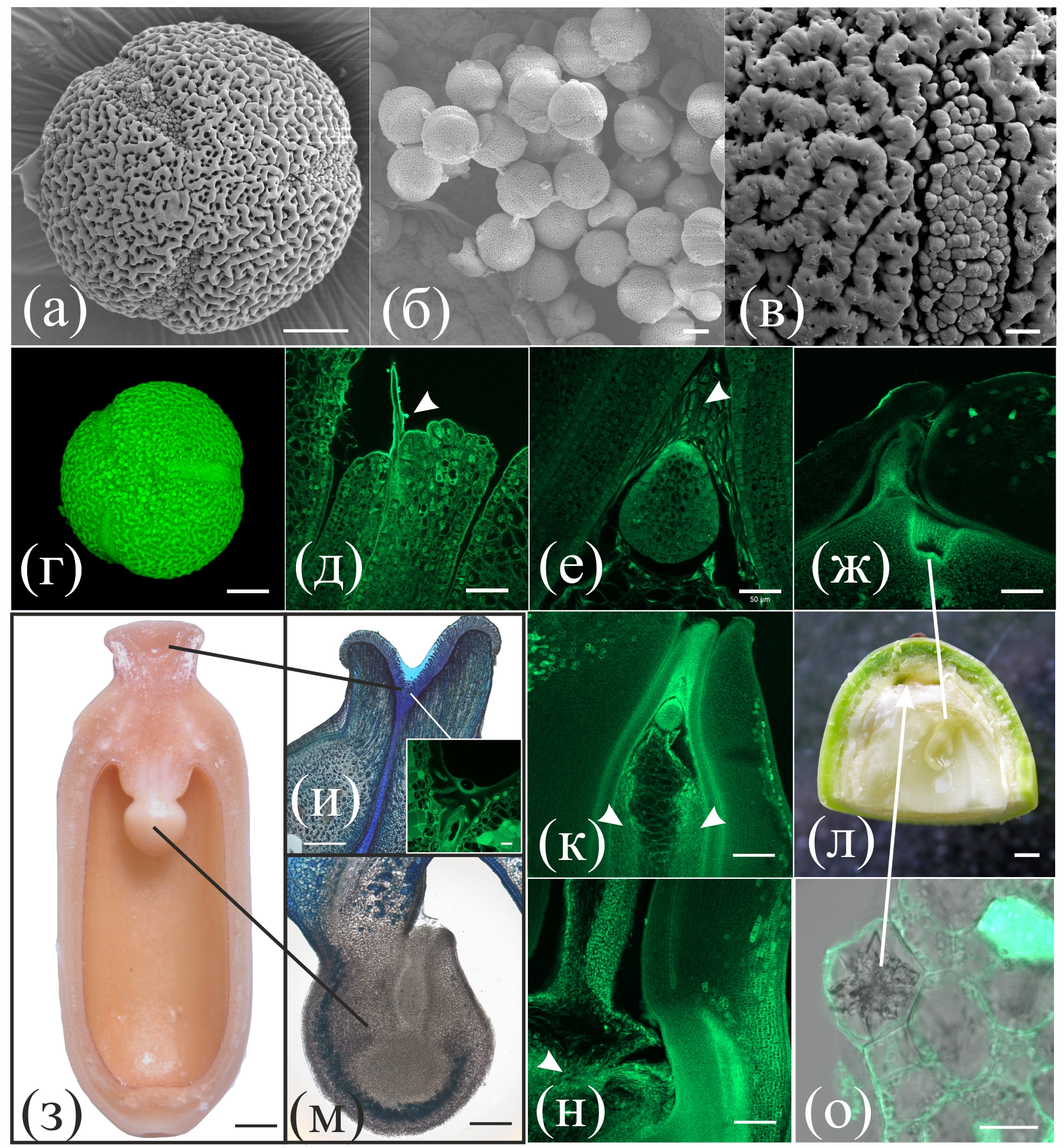 Рисунок 1. Aristolochia trilobata L.: семя (а), зародыш (б), цветок (в), пыльцевое зерно (СЭМ) (г), пыльцевое зерно (ПЭМ) (д), прорастание пыльцевых зерен (СМ) (е), рыльце в разные фазы цветения (ж), микроклоны представителей рода Aristolochia (з).