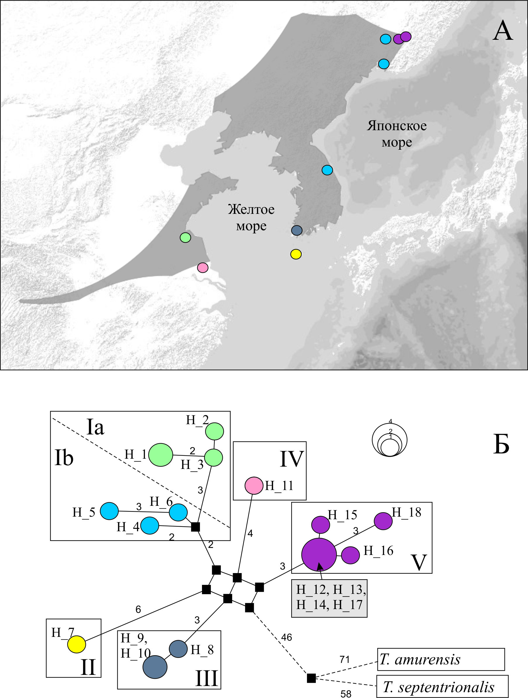 Ареал, места сбора материала, распространение филогенетических групп (А) и сеть гаплотипов корейской долгохвостки Takydromus wolteri (Б). Размеры кружков пропорциональны количеству образцов с данным гаплотипом.