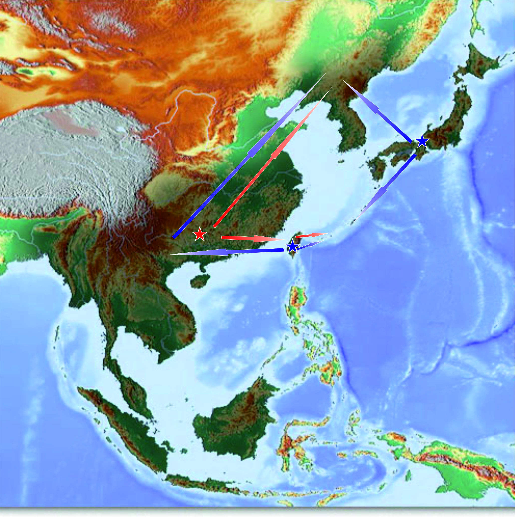 Распространение рода Takydromus, векторы изменения нуклеотидного разнообразия у лесных (синий) и луговых (красный) видов рода. Звездочками указаны центры наибольшего генетического разнообразия.