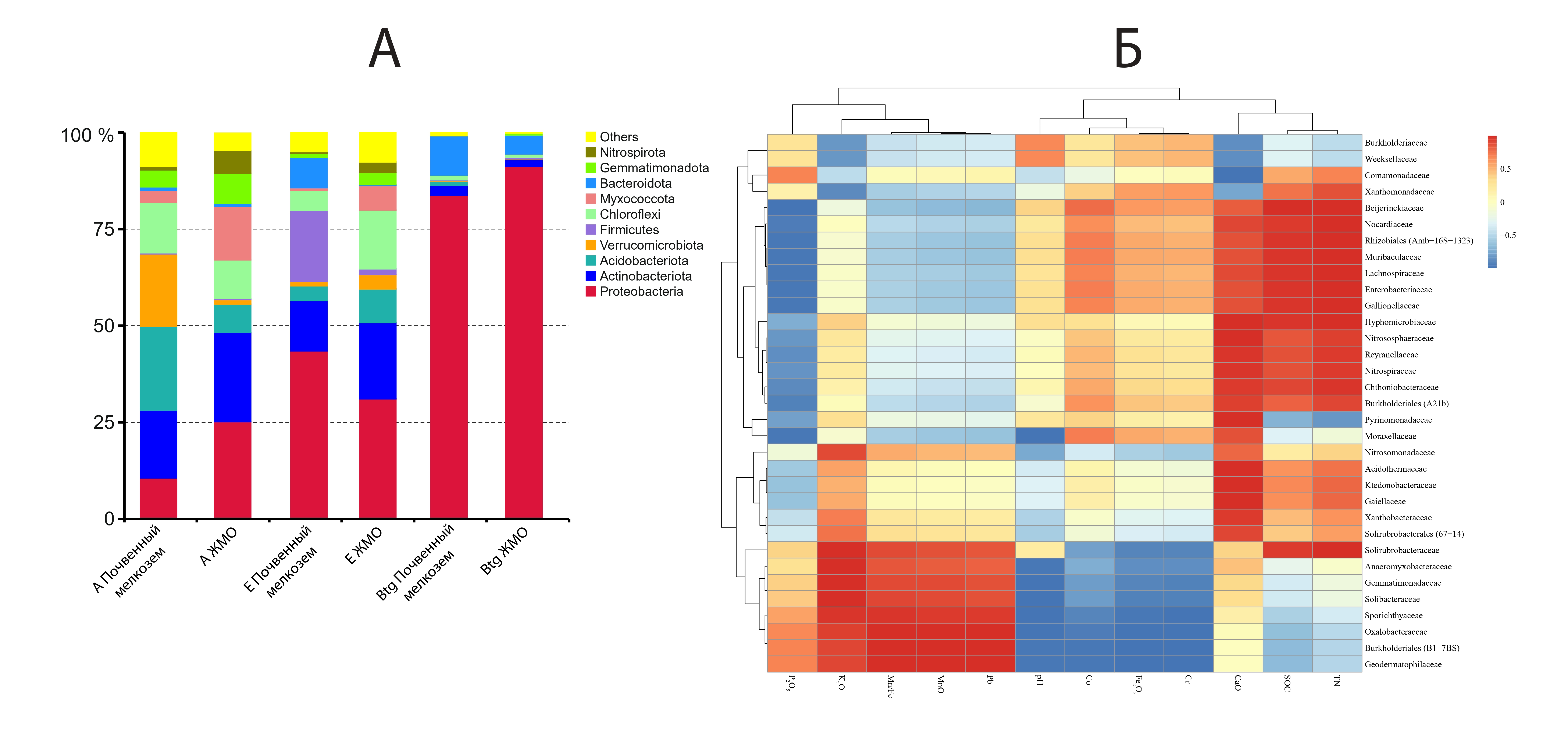 Относительное обилие 10 доминирующих типов бактерий в образцах почвенного мелкозема и ЖМО; Б - Тепловая карта корреляции между относительной численностью доминирующих семейств бактерий и физико-химическими параметрами ЖМО.