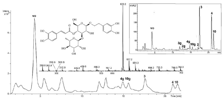 УФ хроматограмма и полный ионный ток экстракта HRC S. lateriflora. VO – verbascoside 4 - wogonin, 3 -baicalein, 10 - 6-ОМе wogonin, and Prefix g – glucuronide