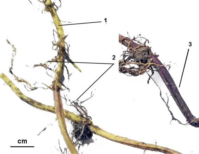 Корни S. lateriflora. 1 – белые корни, 2 – корневые волоски, 3 – темные корни.
