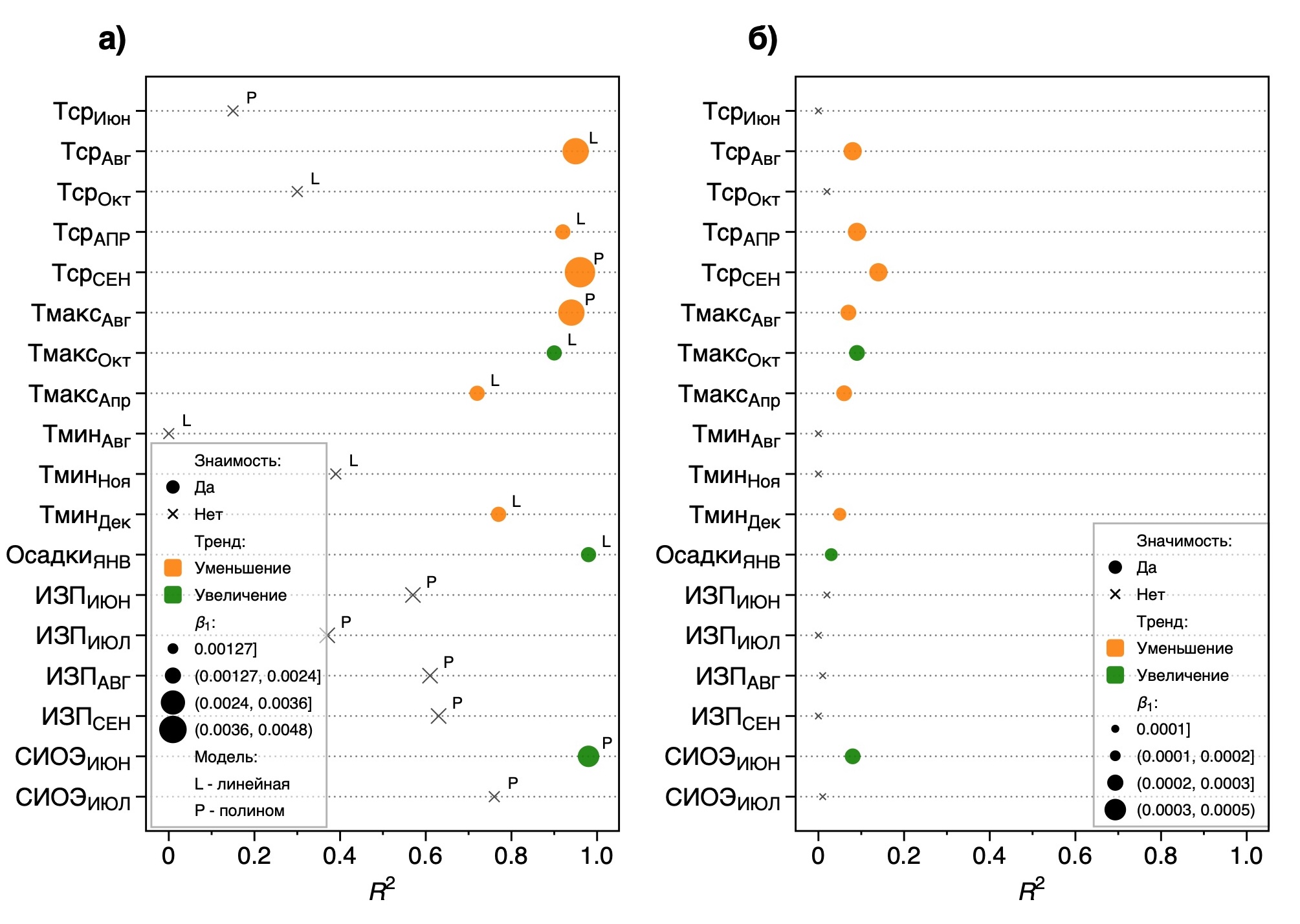 Сравнение результатов регрессионного анализа: а) изменение климатической чувствительности с онтогенетическим развитием, б) изменение климатической чувствительности с камбиальным возрастом. Тср, Тмин, Тмакс - средняя, минимальная и максимальная температура месяца; ИЗП - индекс засушливости Палмера (PDSI); СИОЭ - стандартизированный индекс осадков-эвапотранспирации (SPEI).