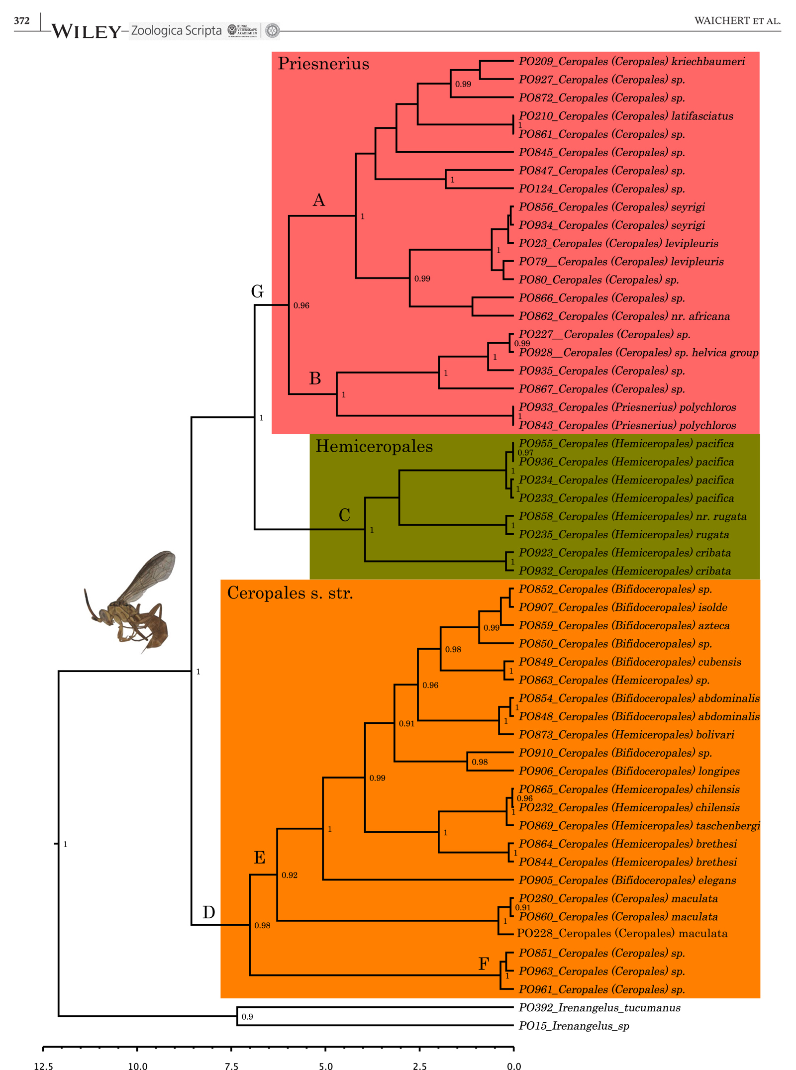Хронограмма рода Ceropales, построенная на двух ядерных и одного митохондриального маркеров.