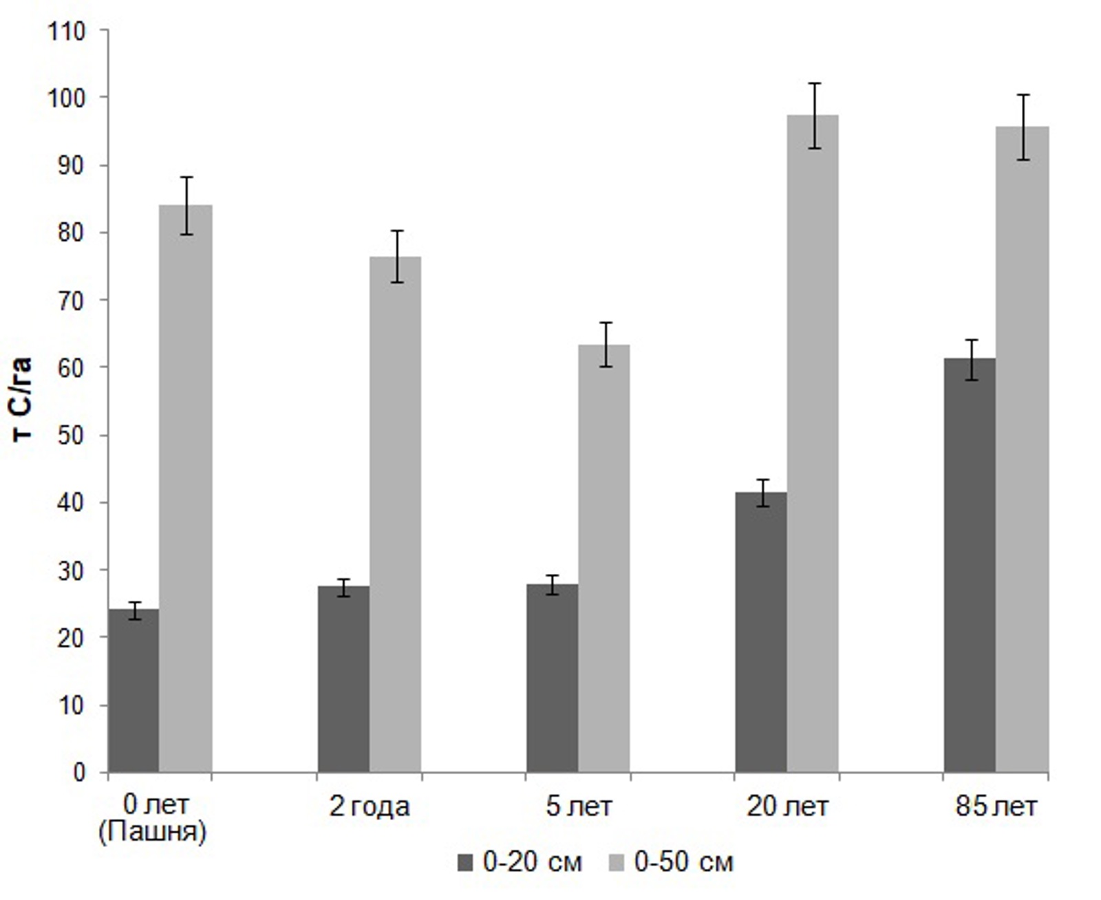 Запасы углерода в пахотных и залежных агротемногумусовых подбелах