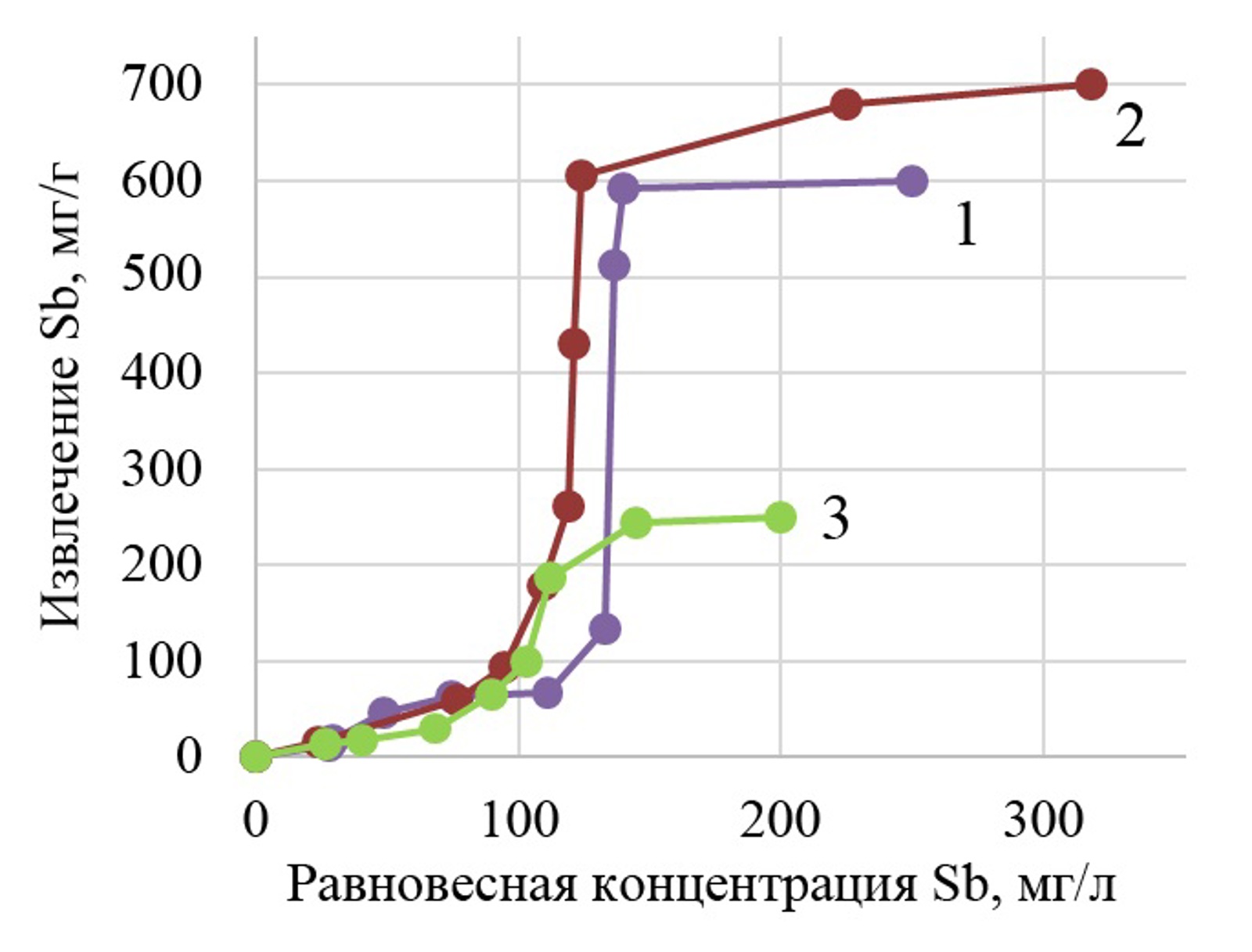 Изотермы извлечения сурьмы из почвенных вытяжек биогенным алюмосиликатом натрия: 1 – водный раствор SbF3; 2 – вытяжка из бурозема + SbF3; 3 – вытяжка из серогумусовой почвы + SbF3