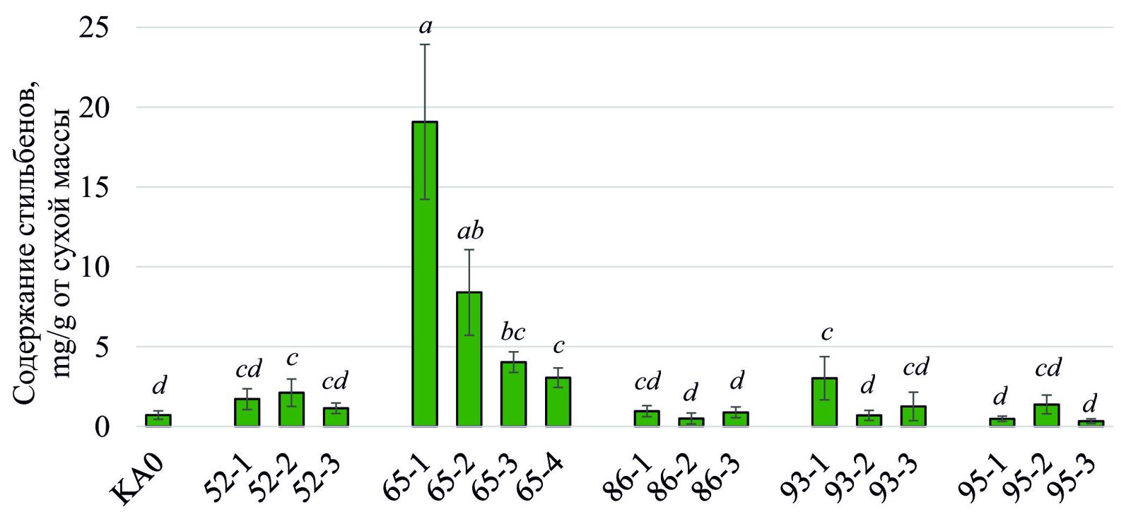 Рис. 1. Увеличение содержания стильбенов, после трансформации генами кальмодулин-подобных белков (VaCML52, 65, 86, 93, 95).