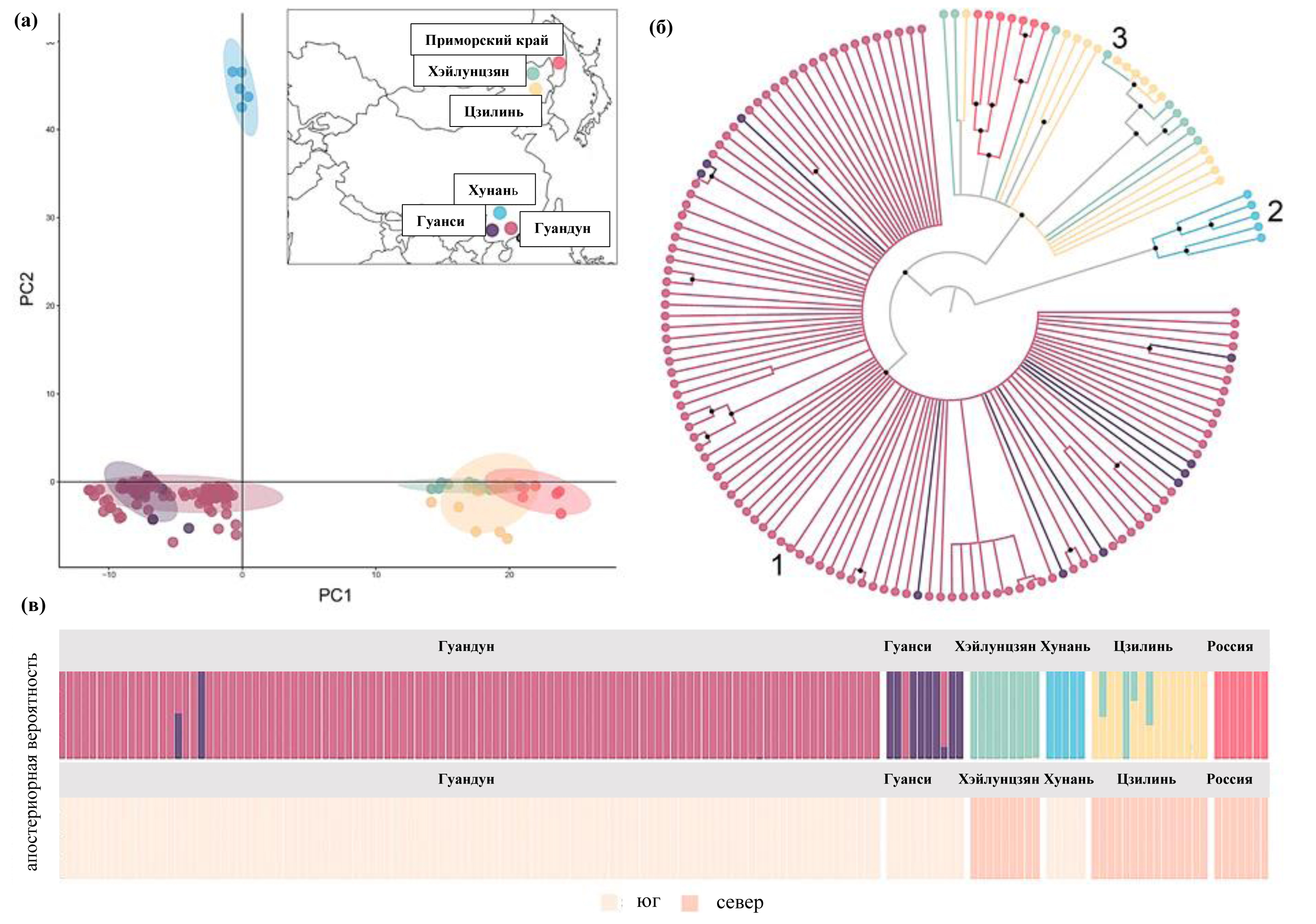Популяционная структура Clonorchis sinensis. (a) Анализ главных компонент (PCA) генетической дифференциации. (б) Согласованное филогенетическое дерево, полученное с помощью байесовского анализа. (в) Гистограммы апостериорных вероятностей членства в соответствии с генетическим кластером (вверху) и группам назначения de novo («юг» и «север»; соответствующие цвета указаны внизу).