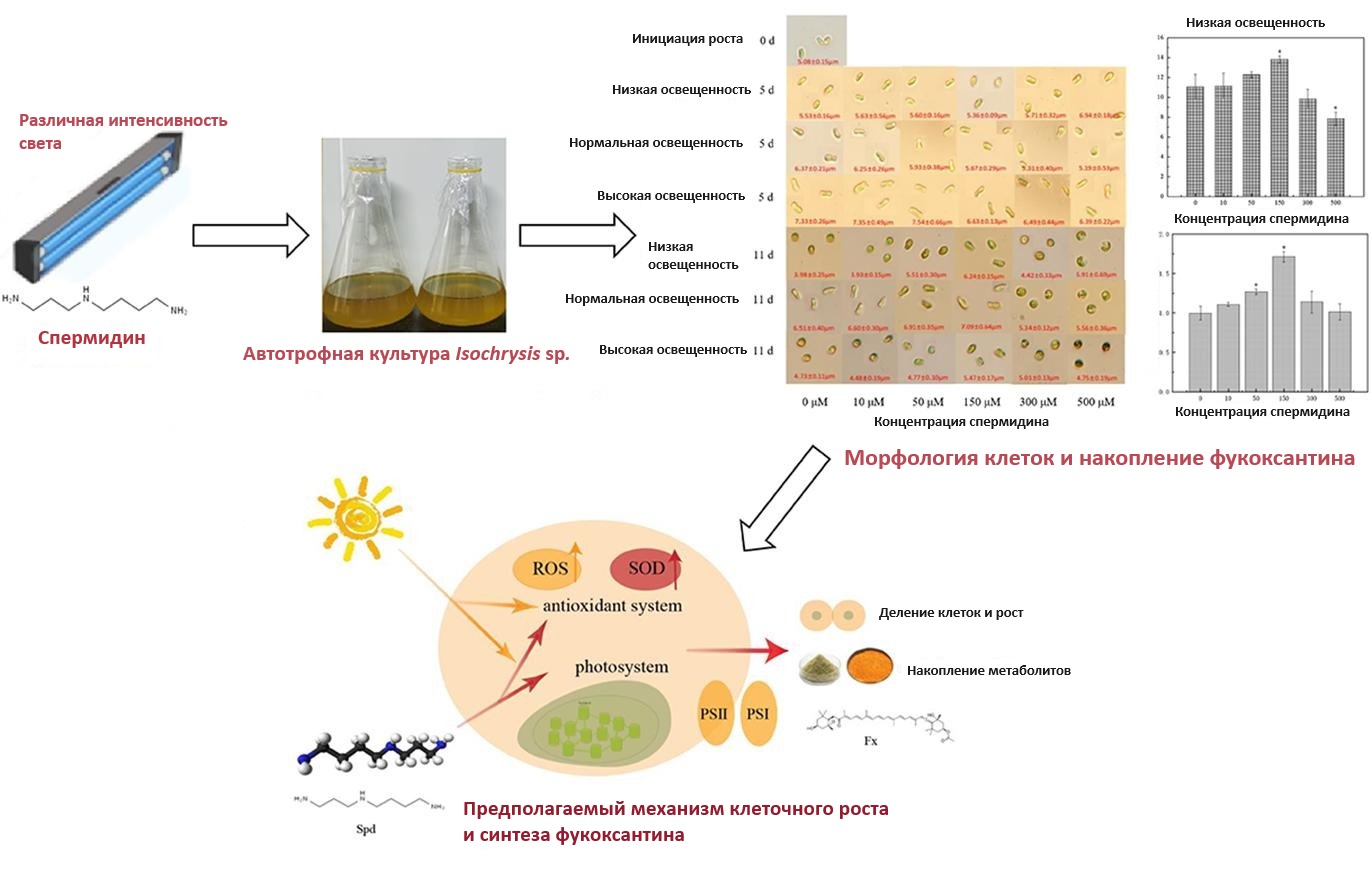 В последние годы микроводоросли привлекают все больше внимания, как продуценты ценных метаболитов. Микроводоросли вырабатывают липиды, жирные кислоты, каротиноиды, различные вещества фенольной группы, составляющие основу пищевой, фармацевтической, косметической и энергетической промышленности. Культуры микроводорослей отличаются друг от друга по разным признакам, в частности, по источникам энергии и углерода. В приведенных материалах международный коллектив ученых исследовал миксотрофные микроводоросли, которые способны совмещать гетеротрофию и фотосинтез, а также влияние спермидина на рост и пролиферацию клеток, синтез фукоксантина при различной интенсивности освещения представителями Isochrysis sp.