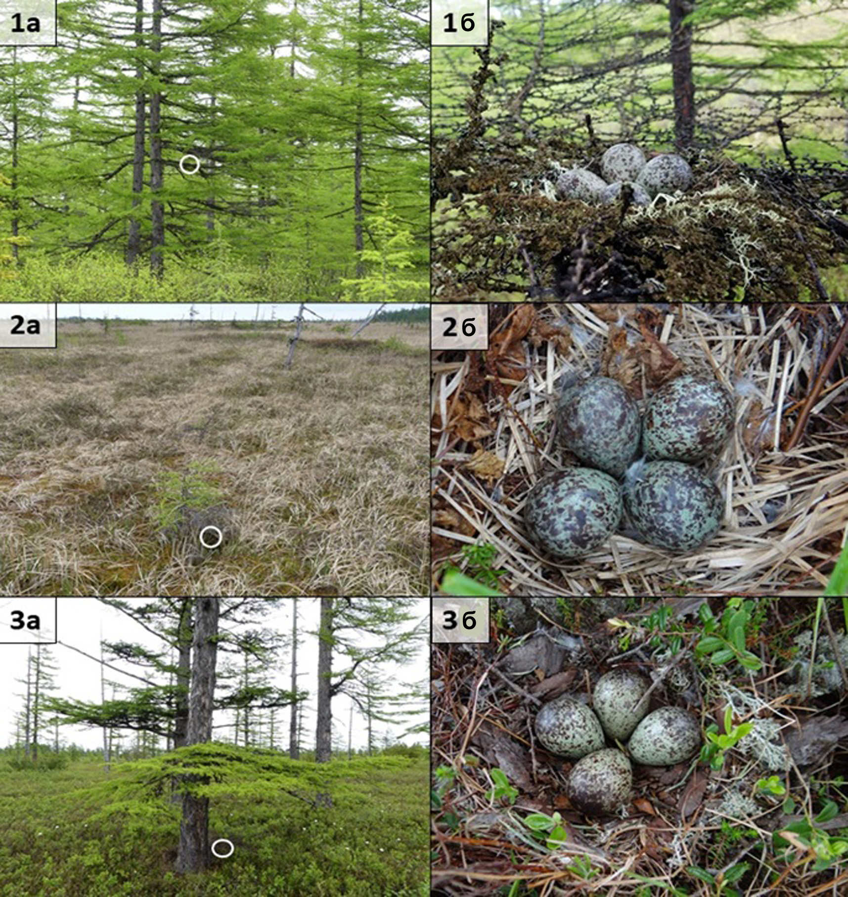 Типы гнездовых биотопов (a) охотского улита и соответствующие им гнезда (б), найденные в 2019-2021 годах в северо-западной части залива Счастья Хабаровского края. Расположения гнезд выделены белой окружностью