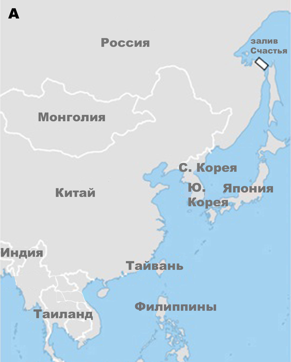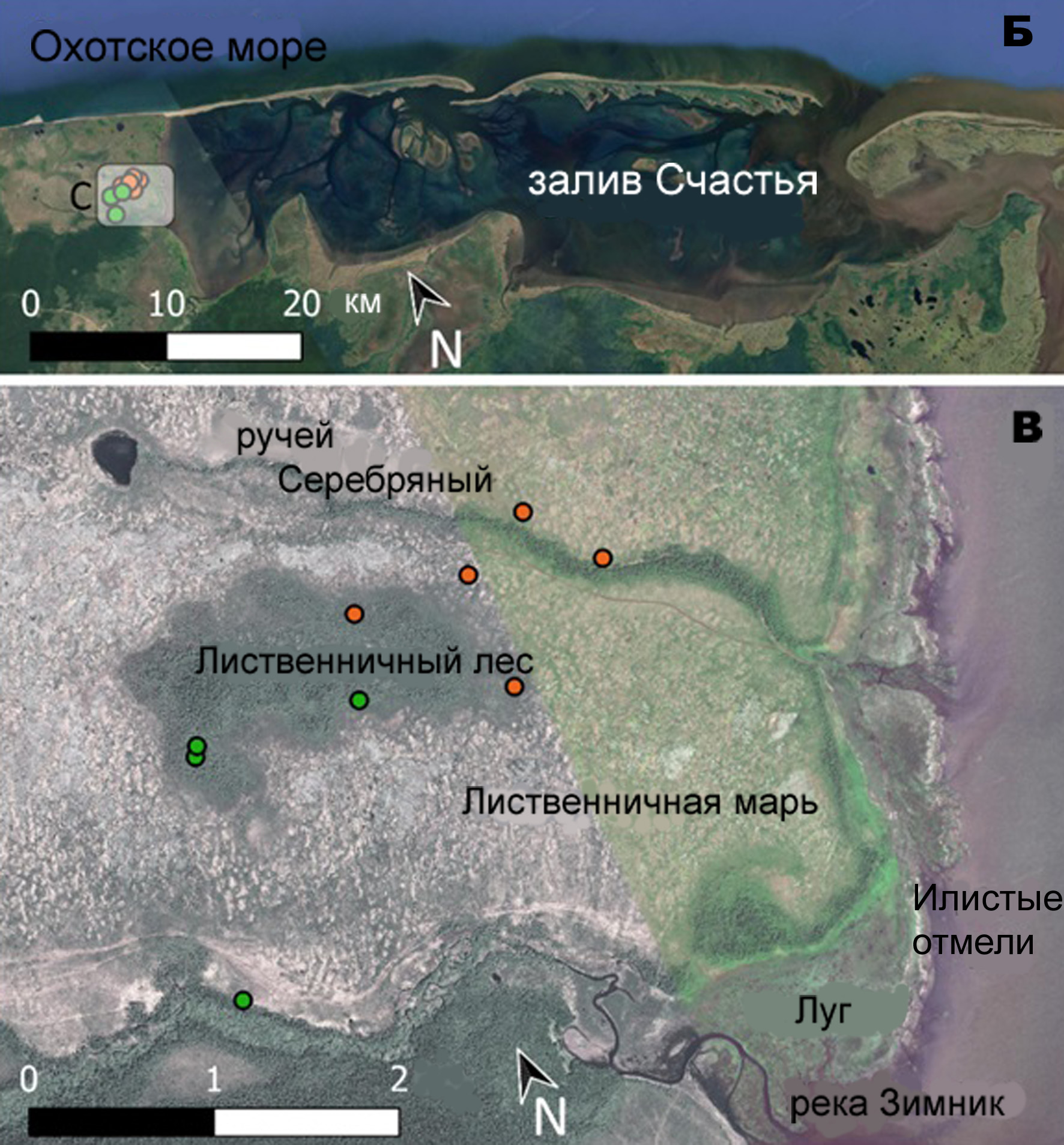 (Б) – Залив Счастья, Николаевский район, Хабаровский край; (В) – модельный участок. Расположение гнёзд (оранжевые точки – наземные, зелёные – на деревьях.