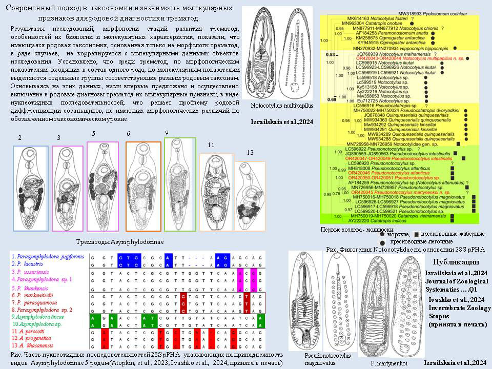 Результаты исследований, морфологии стадий развития трематод, особенностей их биологии и молекулярных характеристик, показали, что имеющаяся родовая таксономия, основанная только на морфологи трематод, в ряде случаев не коррелируется с молекулярными данными объектов исследования. Установлено, что среди трематод, по морфологическим показателям входящих в состав одного рода, по молекулярным показателям выделяются отдельные группы соответствующие разным родовым таксонам. Основываясь на этих данных, нами впервые предложено и осуществлено включение в родовые диагнозы трематод их молекулярные признаки, в виде нуклеотидных последовательностей, что решает проблему родовой дифференциации сосальщиков, не имеющих морфологических различий на обозначенном таксономическом уровне