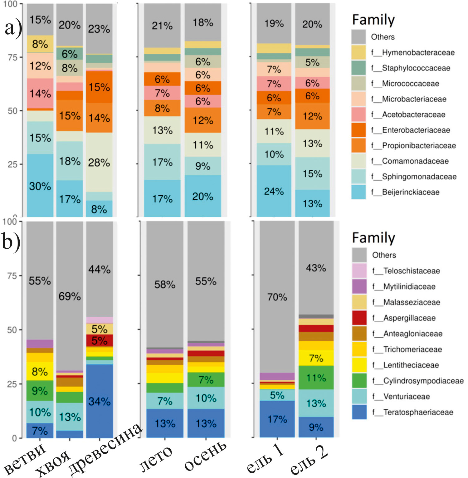 Рис. 1. – Состав бактериальных (а) и грибных (б) эндофитов в разных частях ели Picea jezoensis и сезонах сбора.