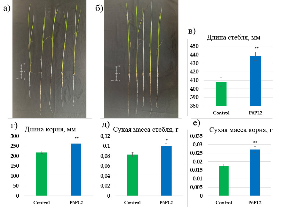 Рис. 2. Влияние инокуляции Gordonia aichiensis P6PL2 на 30-дневные растения риса Oryza sativa (сорта Дубрава). a) контроль; б) растения, обработанные G. aichiensis P6PL2; в) длина стебля; г) длина корня; д) сухая масса стебля; е) - сухая масса корня. Данные представлены в виде среднего значения ± SE. *, ** - достоверно отличаются от контрольных значений при p ≤ 0,05 и 0,01 соответственно по t-критерию Стьюдента.