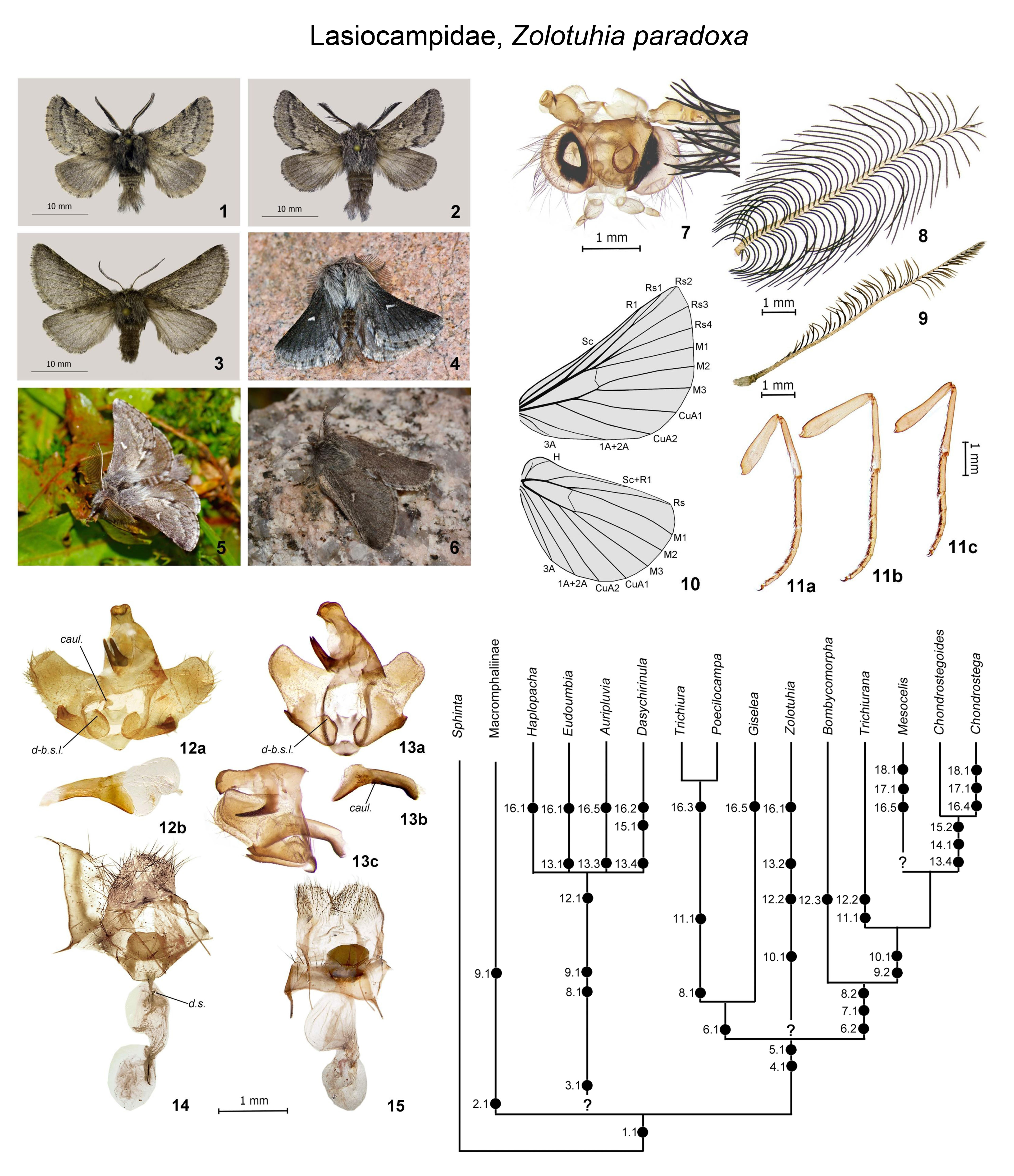 Имаго Zolotuhia paradoxa gen. et sp. nov. (Lasiocampidae), морфологические структуры нового вида и кладистическое дерево морфологических признаков коконопрядов подсемейства Chondrosteginae, sensu novo.