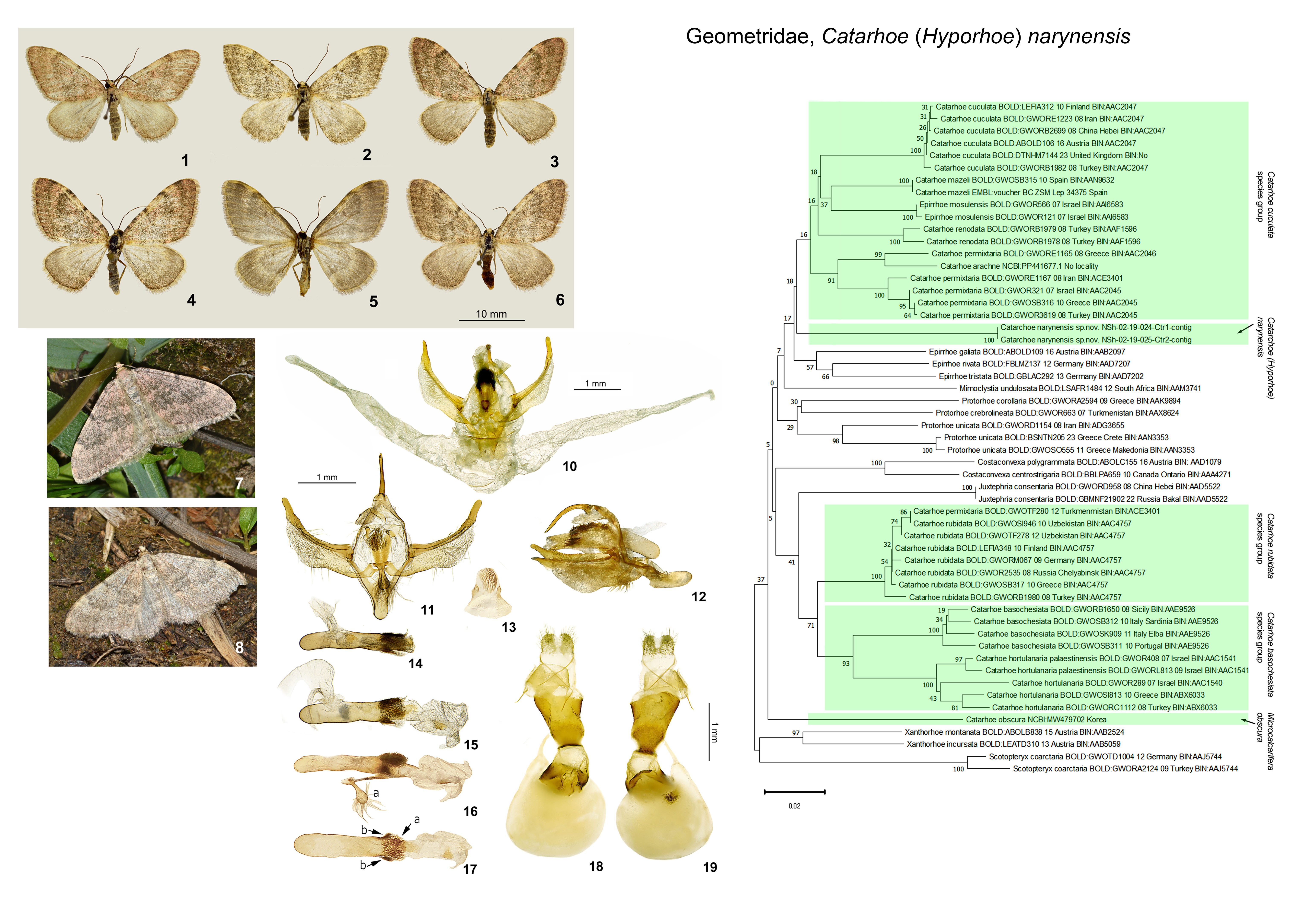 Имаго Catarhoe (Hyporhoesubgen. nov.) narynensis, sp. nov., гениталии самца и самки. Филогенетическое дерево избранных видов трибы Epirrhoini (Geometridae) на основе последовательностей фрагмента COI.