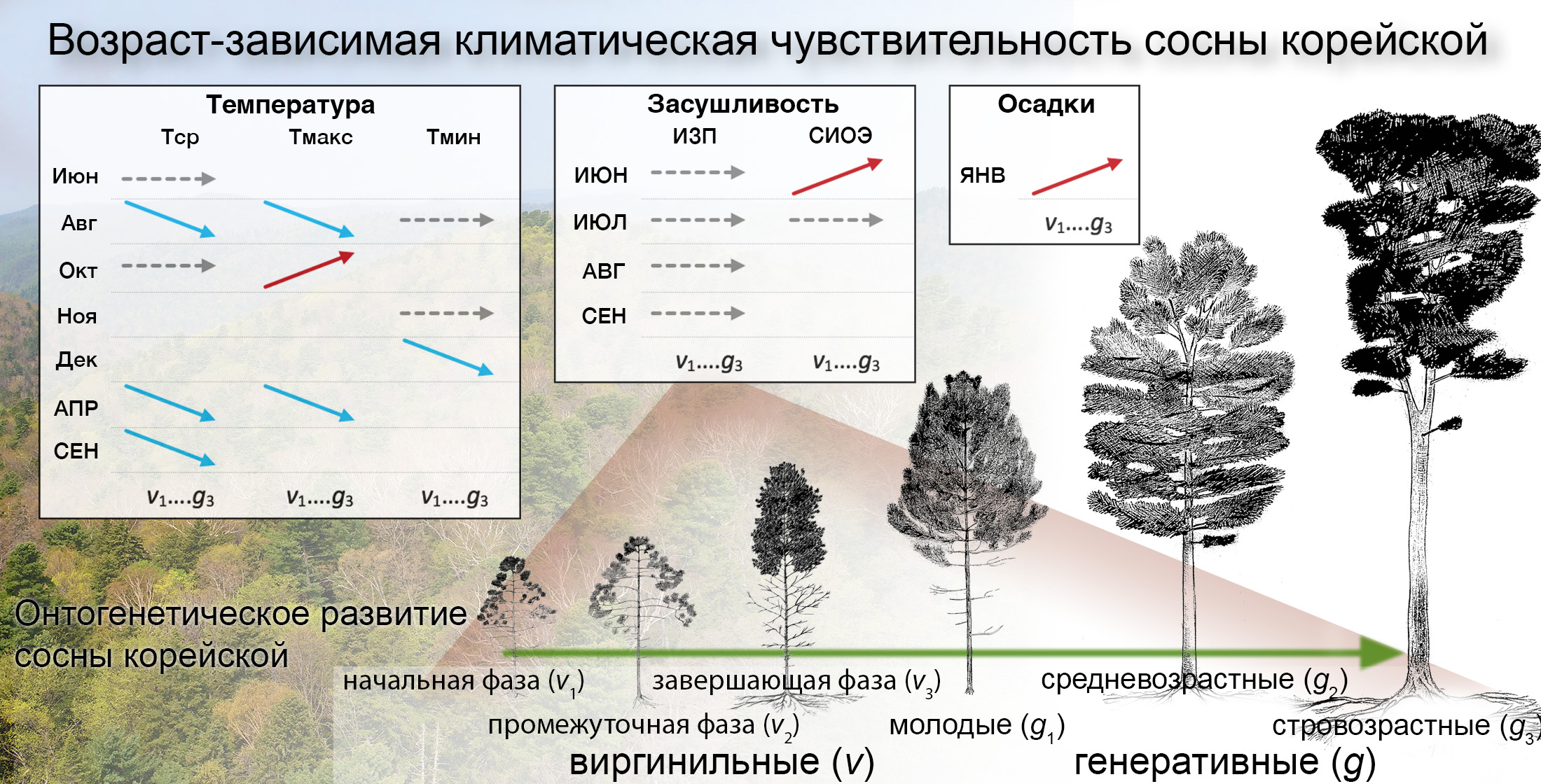 Схематичное описание изменения климатической чувствительности сосны корейской с возрастом.