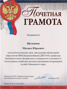 22 марта 2018 г. состоялось совещание ветеринарных специалистов Приморского края, на котором заведующему лаборатории вирусологии д.б.н. Щелканову М.Ю. была вручена Почётная грамота КГБУ "Краевая ветеринарная противоэпизоотическая служба" (Приказ № 16 от 21.03.2018) за "активное и плодотворное содействие научным программам ветеринарной службы Приморского края".