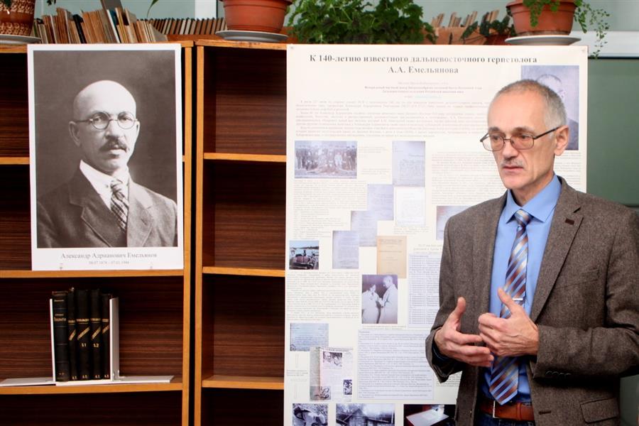 14 декабря 2018 года в ФНЦ Биоразнообразия ДВО РАН (Владивосток) прошла региональная научно-практическая конференция"Чтения памяти профессора А.А. Емельянова (1878–1946)", приуроченная к 140-летию со дня рождения Александра Адриановича. Она собрала ученых ДВО РАН, ДВФУ, студентов, аспирантов и даже любителей-террариумистов.