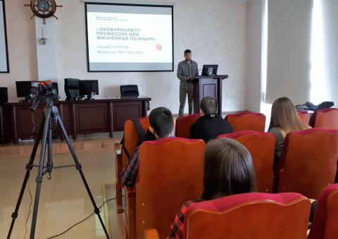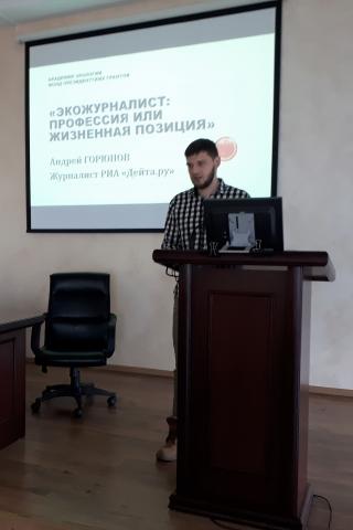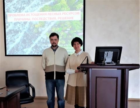 С докладом на заседании выступили сотрудники ФНЦ Биоразнообразия ДВО РАН ОМЕЛЬКО Александр Михайлович и УХВАТКИНА Ольга Николаева, которые рассказали о проблеме истощения лесных ресурсов, о её причинах, последствиях, а также предложили её решение. Аудиторию лектория в основном составляли студенты 3 курса ВГУЭС и другие слушатели Академии, в том числе сотрудники центра. Также перед слушателями выступил А. Горюнов, журналист РИА "Дейта.ру" с сообщением "Экологическая журналистика: профессия или жизненная позиция".