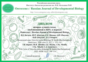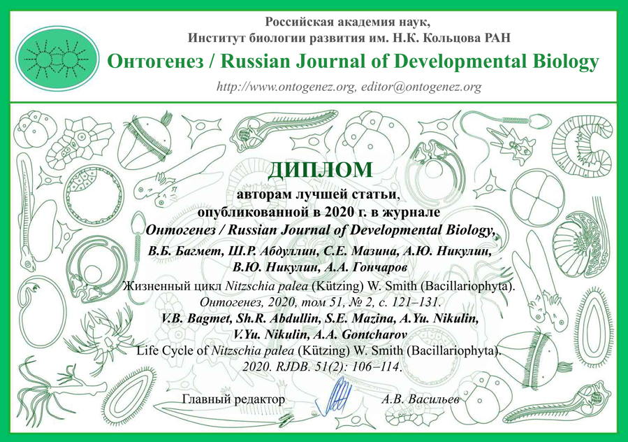 Статья сотрудников лаборатории ботаники ФНЦ Биоразнообразия ДВО РАН В.Б. Багмет, Ш.Р. Абдуллина, А.Ю. Никулина, В.Ю. Никулина и А.А. Гончарова (совместно с коллегой из Московского государственного университета им. М.В. Ломоносова С.Е. Мазиной) признана лучшей статьей российского переводного научного журнала Онтогенез / Russian Journal of Developmental Biology за 2020 г.: Bagmet V.B., Abdullin Sh.R., Mazina S.E., Nikulin A.Yu., Nikulin V.Yu. and Gontcharov A.A. Life cycle of Nitzschia palea (Kützing) W.Smith (Bacillariophyta) // Russian Journal of Developmental Biology. 2020. Vol. 51. No 2. P. 106–114. https://doi.org/10.1134/S1062360420020022