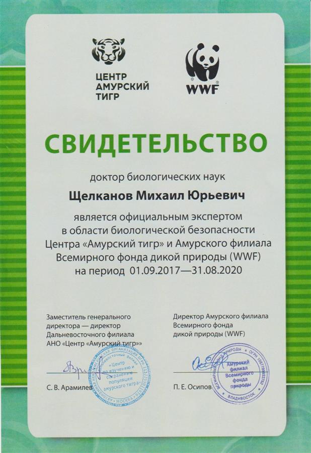 Заведующий лабораторией вирусологии д.б.н. Щелканов М.Ю. стал официальным экспертом в области биологической безопасности Центра "Амурский тигр" и Амурского Филиала Всемирного фонда дикой природы, продлив тем самым свой мандат ещё на три года.